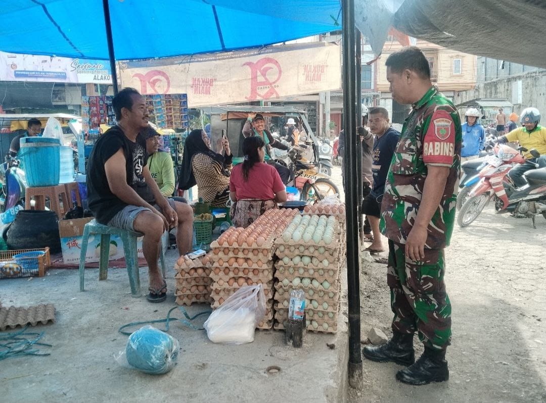Babinsa Koramil 05/Dua Pitue Monitor Ketersediaan Dan Harga Bahan Pokok Di Pasar Sentral Tanru Tedong