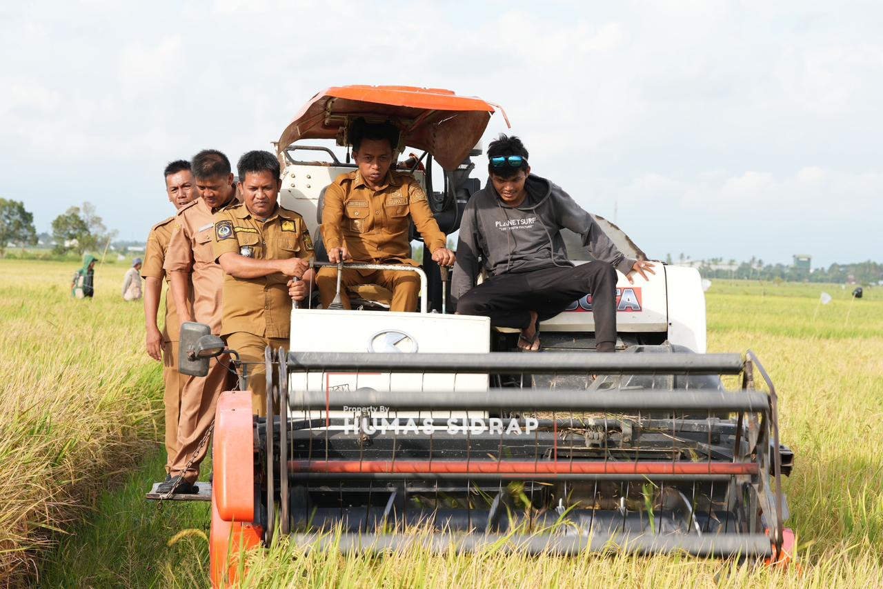 Pada kesempatan itu, Bupati Sidrap secara langsung mengoperasikan mesin combine harvester sebagai simbol penerapan mekanisasi pertanian untuk meningkatkan efisiensi dan kecepatan panen di daerah tersebut.