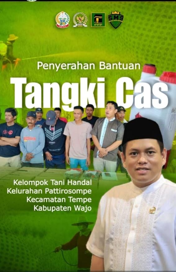 Wajo, ππͺπ‘ππ¬ππ¨ππ₯π‘πͺπ¨.ππ€π’[14/12/25] β Wakil Ketua DPRD Provinsi Sulawesi Selatan, Supriadi Arif S.Pd.I., M.Si., menyerahkan bantuan berupa tangki cas kepada Kelompok Tani Handal di Kelurahan Pattirosompe, Kecamatan Tempe, Kabupaten Wajo. Penyerahan ini merupakan wujud dukungan nyata dari pemerintah provinsi terhadap peningkatan hasil pertanian di wilayah tersebut.